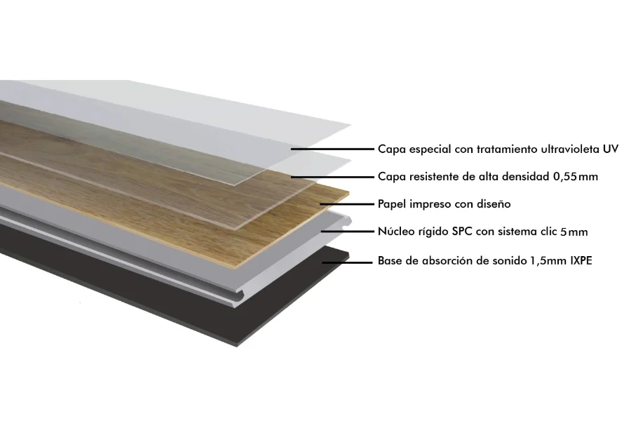 El PVC (Policloruro de vinilo) es un material plástico altamente versátil que se ha convertido en uno de los más populares para revestimientos de suelos. El suelo vinílico PVC está compuesto por varias capas: una base flexible, una capa decorativa y una capa protectora transparente que le da resistencia y brillo. A diferencia de otros materiales, combina durabilidad, elasticidad y una excelente resistencia al agua, ofreciendo una sensación cálida y agradable al caminar.